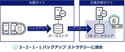 2次バックアップ 兼 災害対策 兼 ランサムウエア対策として遠隔地のオンプレミス上のCyber Resilientデータストアにレプリケート。