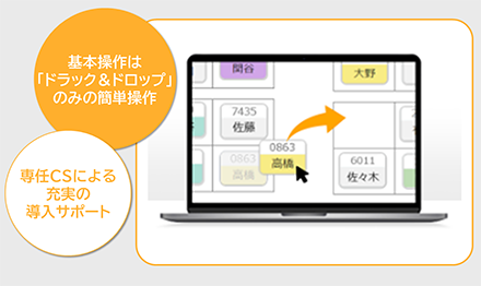アスマーク社による説明会(オンライン)の実施やレイアウトの作成など、運用開始までのサポートも充実しているため、導入から定着まで安心してご利用いただけます。