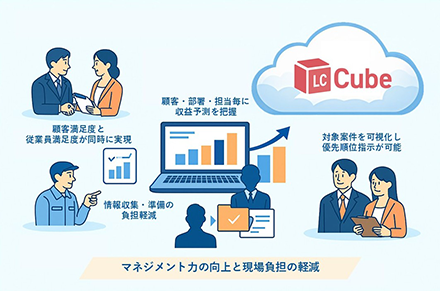 顧客ごと・部署ごと・担当者ごとに、収益予測を把握できます。対象案件を可視化し優先順位を指示できます。異動や退職に伴う案件振分け、予算配分などもフェアに迅速に実施できます。営業・施工現場は、修繕計画の共有により、事前情報収集や提案準備などの負担が軽減。効率的な運用が可能になります。顧客満足と従業員満足を同時に実現します。