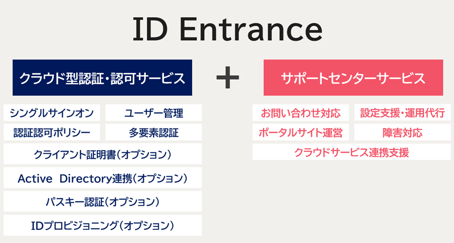 ID Entranceは、クラウドサービスのID・パスワード情報を統合管理し、シングルサインオン(SSO)を提供するIDaaSです。多要素認証やクライアント証明書、パスキー認証などにより、ゼロトラストモデルを支える強固な認証を実現します。さらに、AD連携やIDプロビジョニングによる運用効率化に加え、標準で付帯するサポートセンターによる運用代行サービスにより、お客さまの運用負荷を軽減。認証という業務の重要な基盤において、セキュリティと利便性を両立します。