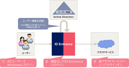 Active Directory連携によって、Windowsログオンで自動的にID Entranceおよびクラウドサービスへ再認証なしでアクセスできるように。ネットワーク上に認証情報を平文送信しないため、セキュリティも強化します。なお、利用には、AD連携(LDAP型)オプションの契約が必要です。