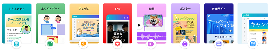 プレゼンテーション、ドキュメント、動画、画像、ポスター、チラシ、メニュー、名刺、SNS投稿、広告バナーなど、あらゆるデザインを作成できます。