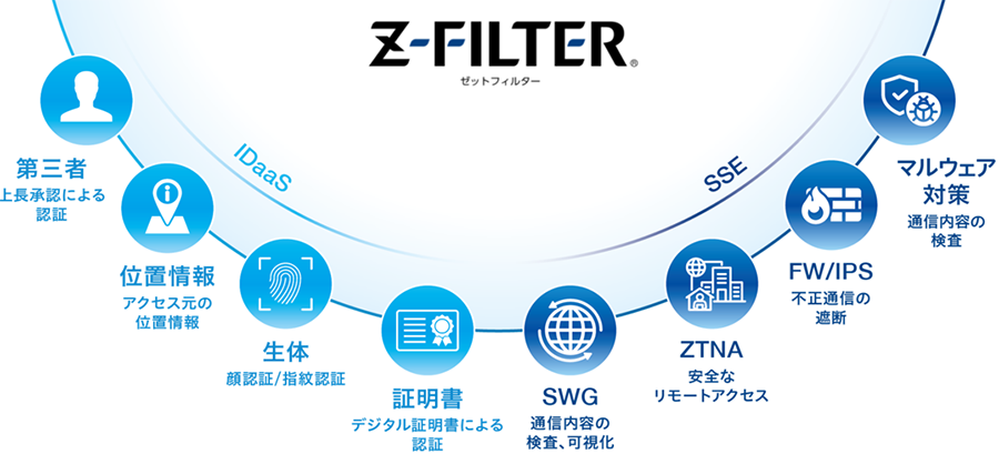 位置情報認証や第三者認証などデジタルアーツ独自の認証でネットワークの入り口保護を強化し、SSEによるネットワークの安全性の担保を「Z-FILTER」で一手に担うことで、煩雑な設定や運用工数を最小限に抑えます。