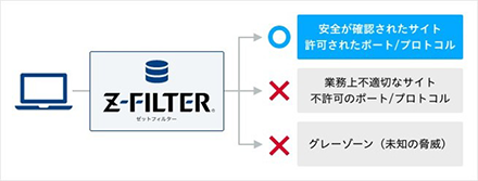 ID認証から端末・通信制御、見える化、ログ管理まで一つの管理画面に統合しているため、アクセスから認証までのゼロトラスト運用を「Z-FILTER」だけで一貫して実現します。