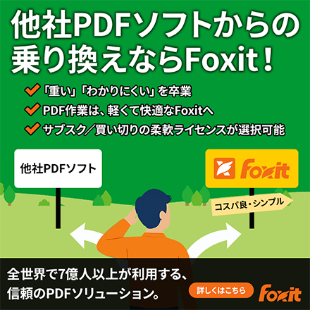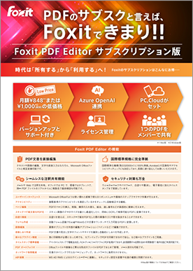 Foxit PDF Editorシリーズは、国際標準規格ISO32000-1に準拠、Acrobatに代わるPDFソフトとして注目され描画再現性にも問題がありません。買い切り版とサブスクリプション版の2つのライセンス形態でご提供が可能です。高速安定動作で定評のあるFoxitの技術はGoogle ChromeやAmazon Kindleや楽天Koboにも採用され日本企業のさまざまな業種に採用実績があります。Acrobatの機能をステップ数を少なく実現し軽快な動作と直感的に使えるMicrosoft Officeのようなリボンメニューで多彩なPDF変換や編集機能をご使用いただけます。大規模ライセンスはAdmin Consoleで管理、サブスク版はChatGPT連携を実現しPDFの活用範囲をさらに拡げます。