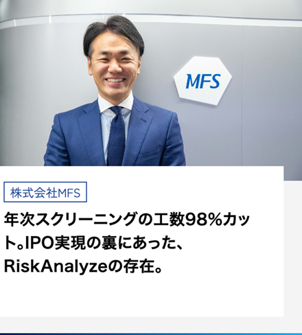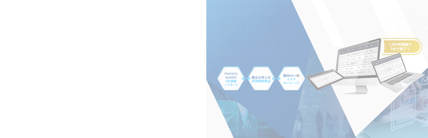 RiskAnalyzeは、企業のリスク管理とコンプライアンス強化を支援するWEBサービス(SaaS)型反社チェック・コンプライアンスチェックサービスです。