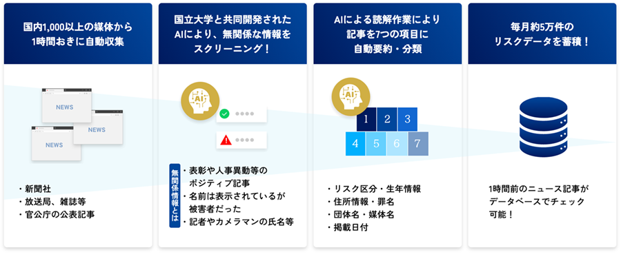 国内外の情報を保有しています。国内は約1,000媒体(新聞・雑誌・TV局・行政処分・訴訟情報など)から1時間ごとに情報を収集し、読解・判定したうえでデータベース化しています。国外はPEPs・Sanction、AML/CFTに対応したメディア情報を常時アップデートしています。
