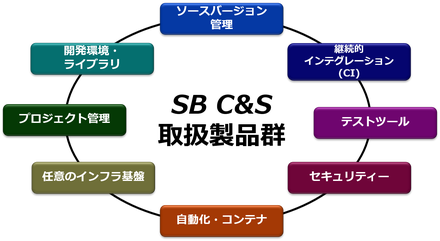 SB C&SではITディストリビューターとしてコンテナプラットフォーム、Git管理、インフラの自動構成管理、CI/CD、ローコード開発、セキュリティなどDevOpsを実践していく上で必須な製品を多々取り揃えております。 -