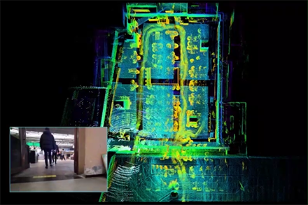 フォークリフトの周囲の障害物を検知するだけでなく、自己位置の推定にも応用することができます。