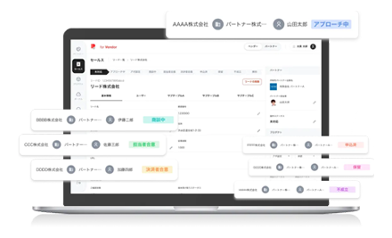 パートナーの現場担当者が入力する案件管理情報を、双方でリアルタイムに共有できる共同CRMです。パートナー企業と同じ案件情報を見ながら販促を進められ、「いつ」「誰が」「どのように」提案したのかを正確に把握。その結果、売り手・パートナー双方が同じ前提で動ける “最適なフォローアップ体制” を実現します。