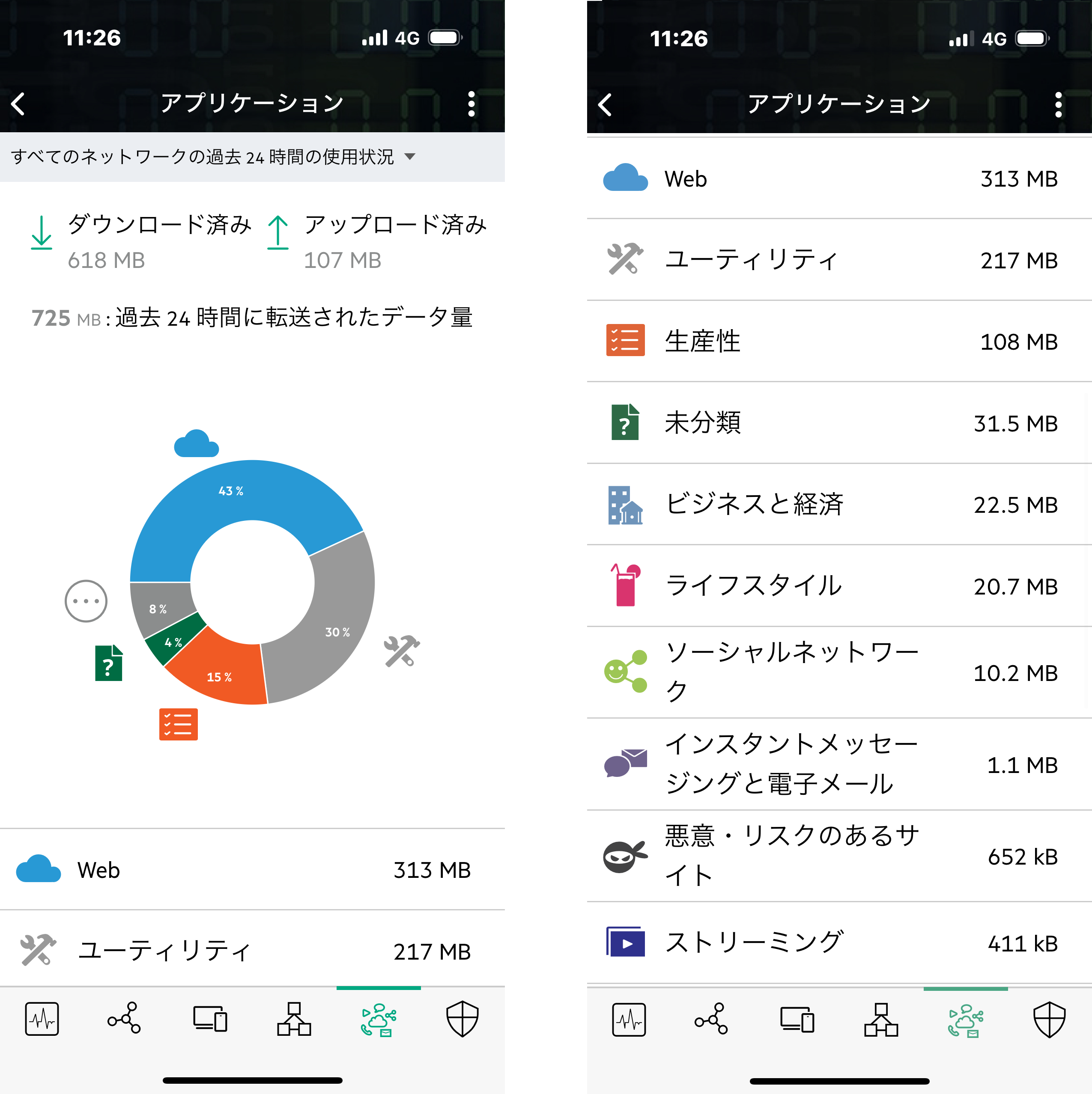 クラウドでネットワークを詳しく可視化し、簡単に管理できることも、「HPE Networking Instant On」シリーズの特徴です。アプリやWebブラウザでは、Instant On デバイス、接続クライアント機器、ネットワークのヘルスステータスの概要と、トリガされたアラートのリストを「健全性」として表示。また、どんなWebサイトやサービスにアクセスしているかも、グラフで可視化。利用するスタッフやお客様、お子さんなどがどんなコンテンツを見ているのかもざっくりと把握できます。家庭で使えるWi-Fiアクセスポイントでここまで分析できるのは珍しいのではないでしょうか。