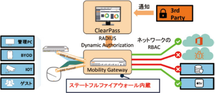 ユーザ、端末属性に応じたネットワークポ リシーを動的に適用し、ClearPassと3rd Party連携によりマルウェア感染端末を直ちに隔離することができます。 -